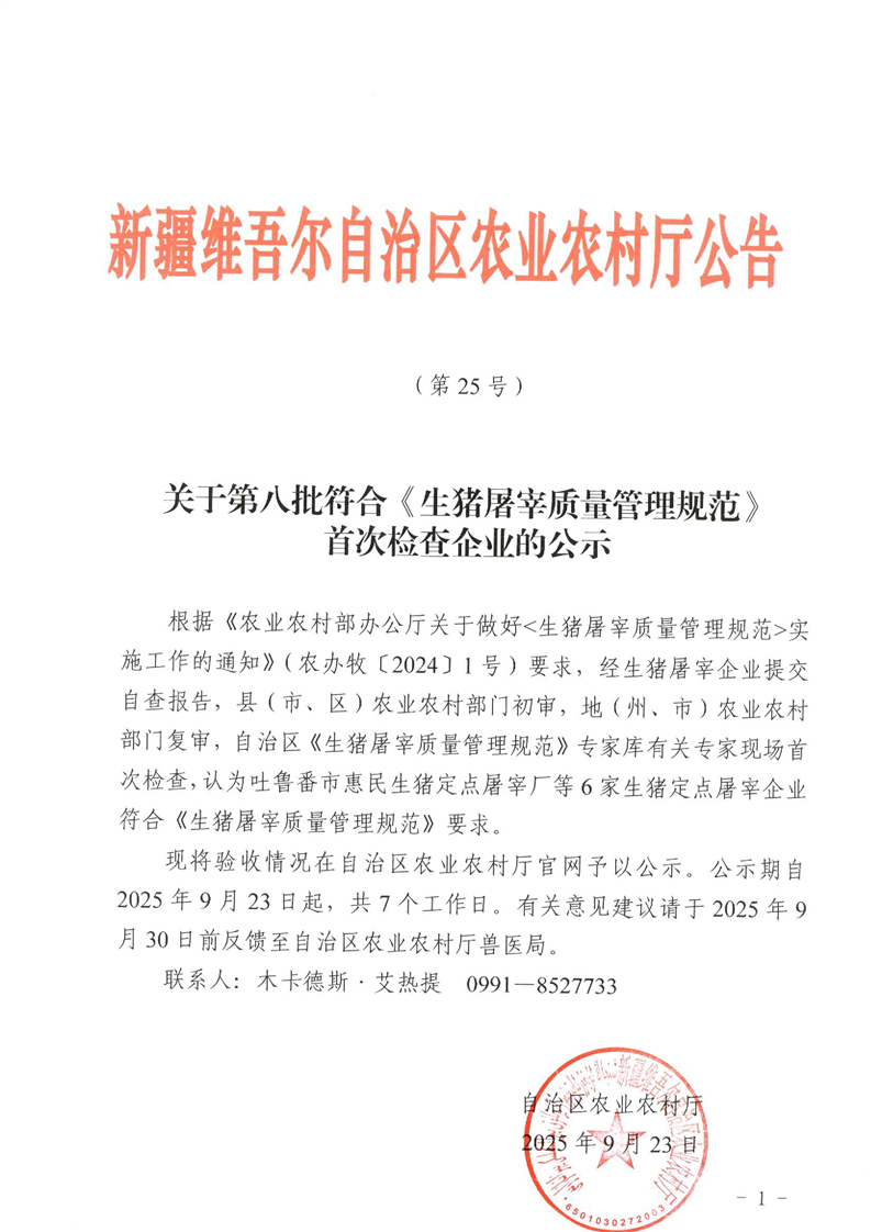 关于第八批符合《生猪屠宰质量管理规范》首次检查企业的公示